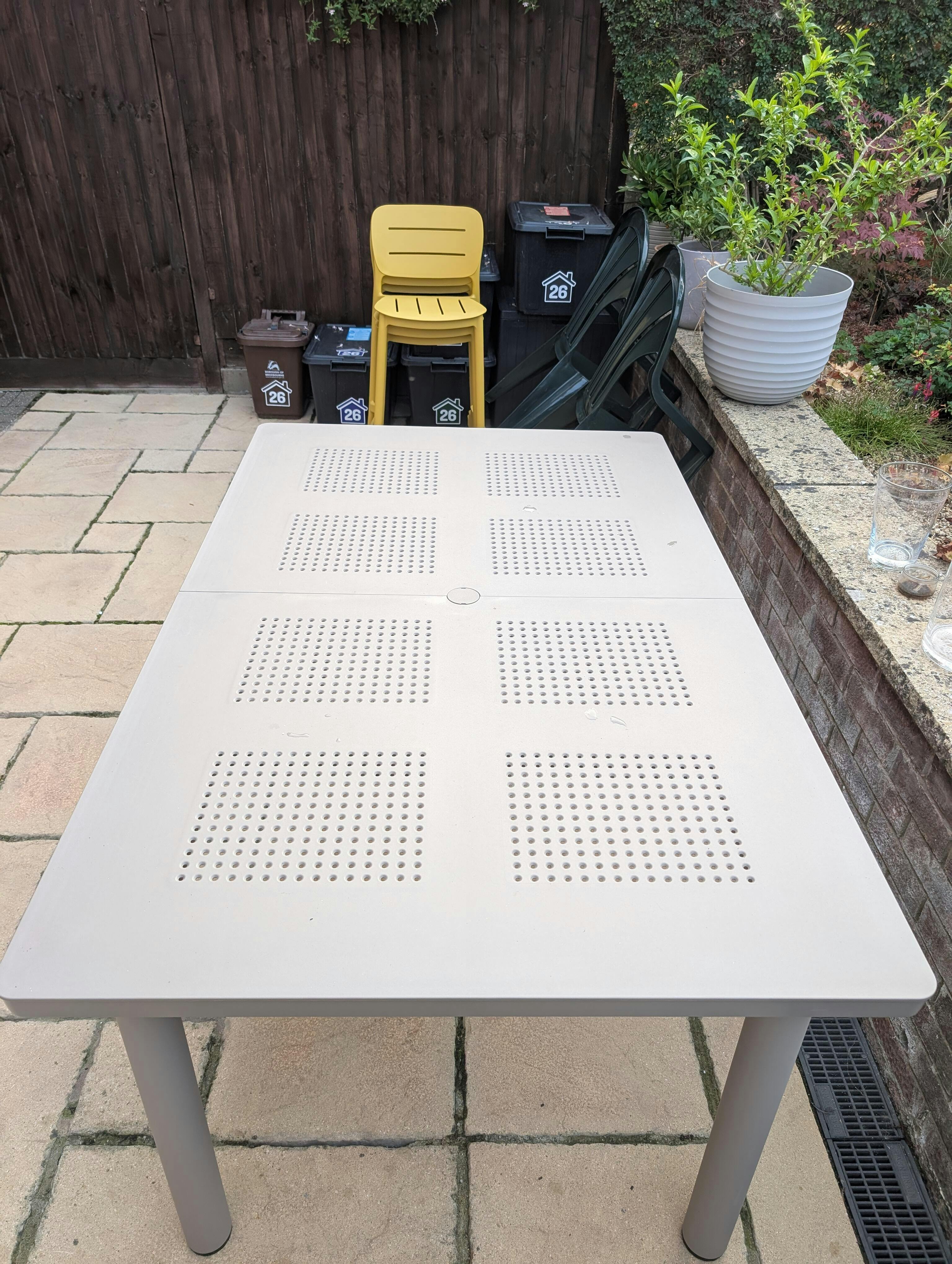 The Libeccio table, here in turtle dove grey colour, is immensely strong and constructed from glass-fibre reinforced resin. 100cms. wide by 160cms. long, but extending to 220cms. with the centre leaf inserted. The spare leaf stores under the table when not in use and the parasol hole is accessible with and without the centre leaf. The material has a slightly more matt finish than plain resin, and the Bora, Bistrot, Net and Darsena chairs all match this finish.