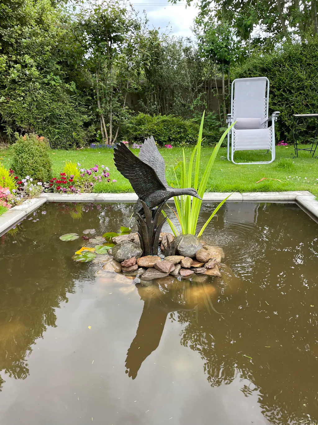 This Duck in flight has superb detailing especially in the wings, cast in weather proof Aluminium and coloured with a beautifully deep dark Verdigris the colours really do highlight the stunning craftsmanship that has gone into this piece.
